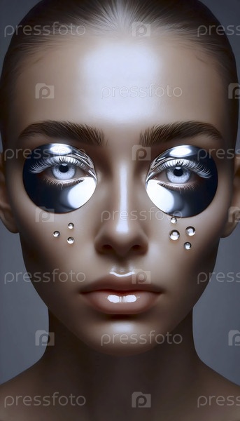 Зеркальная серебряная пленка на веках, отражающая кольцевые круги вспышек, с розовыми ресницами, Ai generated image