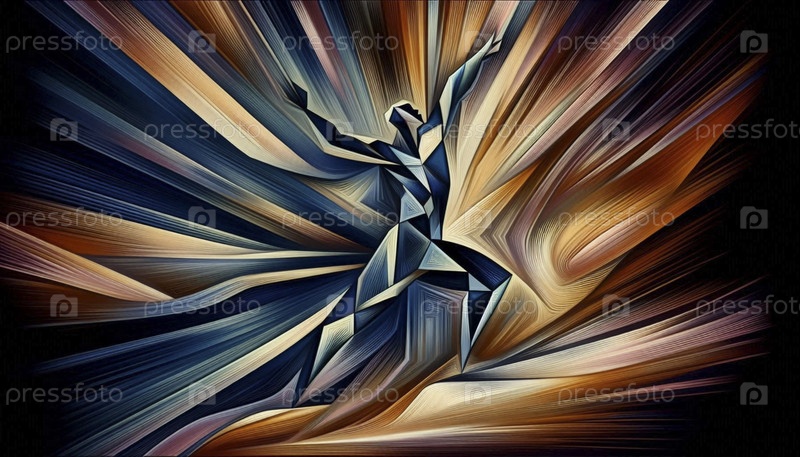 Абстрактная геометрическая композиция йоги из позы воина, преобразованной в острые угловые линии и текучие цветовые поля, Ai generated image