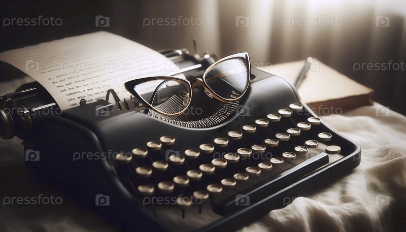 Пара очков для кошачьих глаз, опираясь на открытую пишущую машинку с листом бумаги, содержащей стихотворение, Ай создала изображение