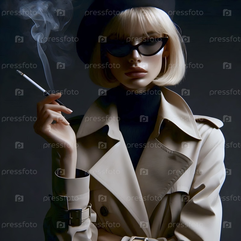 Модель в куртке и берете, держащая сигарету на длинном носителе, дым, изгибающийся вверх, Ai generated image