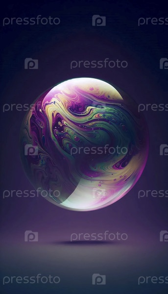 Глицериновый мыльный пузырь плавает перед глубоким фиолетовым фоном, его поверхность - вихревая галактика ирисцентных цветовых карт, Ai generated image
