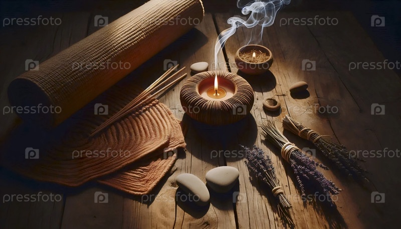 Плоская композиция угловой йоги-матки с терракотной свечой и дымовыми следами в теплом закате на дереве, Ai generated image