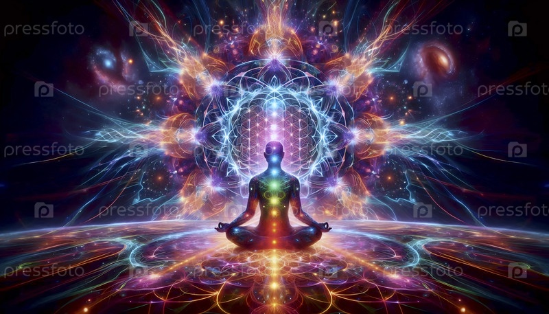 Практикующий йогу в лотосе позирует в центре светящейся космической мандалы с волнами энергии чакры, сливающейся со священной геометрией, Ai generated image