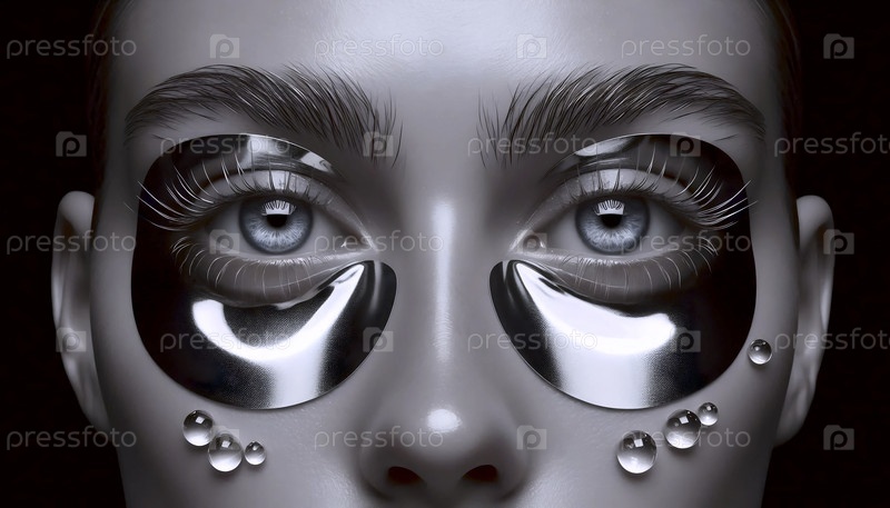 Зеркальная серебряная пленка на веках, отражающая кольцевые круги вспышек, с розовыми ресницами, Ai generated image