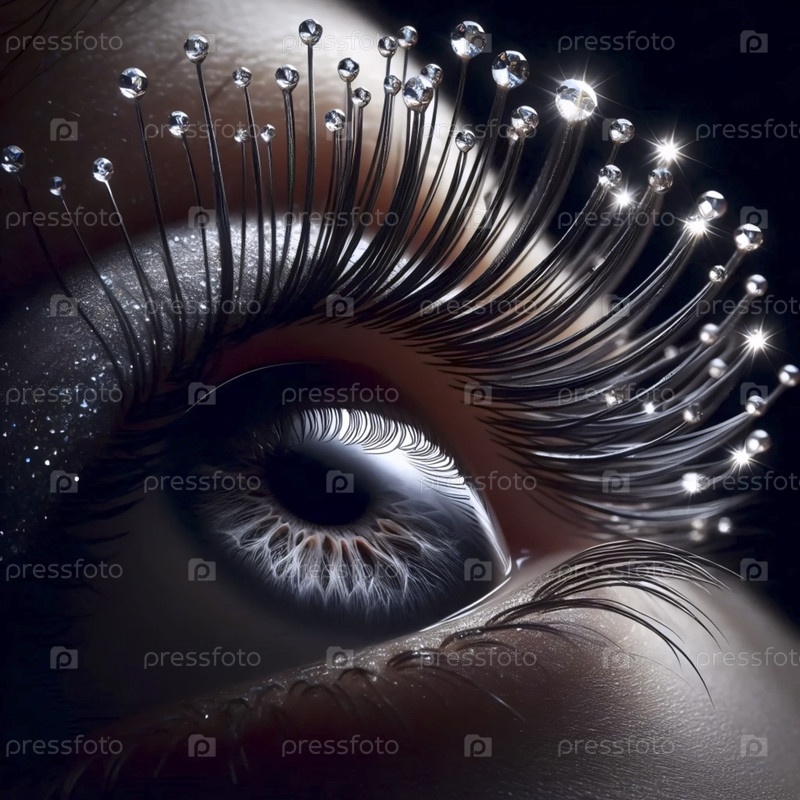 Макропросмотр снизу: отдельные ресницы, увенчанные идеальными серебряными микрокристаллами, Ai generated image