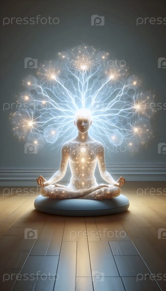 Нейрофитнес-практикующий с сияющими нейронными сетями вокруг головы во время сидячей медитации, Ai generated image