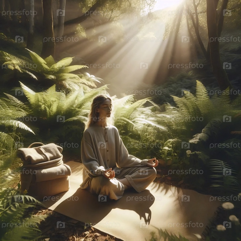 Практикующий эко-йогу сидит в медитации на естественном ютовом ковре в солнечном лесу, окруженный папоротниками, Ai generated image
