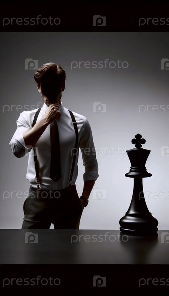 Мужчина в хрустящей белой рубашке и подвесках, лицо которого скрыто тенью большой шахматной королевской фигуры, Ai создал изображение