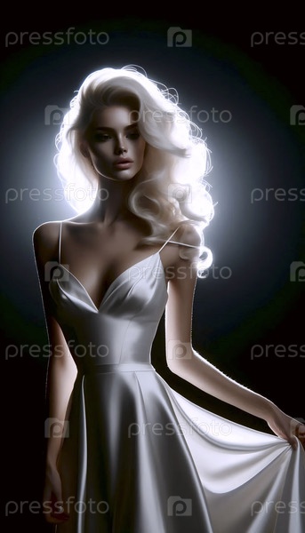 Голливудская звезда в белом атласе, освещенном на черном фоне, один ремень падает с ее плеча, Ai создал изображение