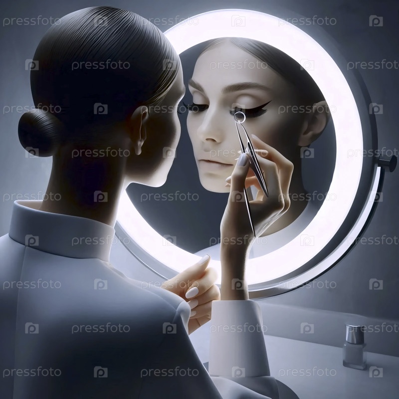 Вид над плечом модели в белом пальто, наносящей капли росы пинцетом, увиденный в зеркале, Ai generated image