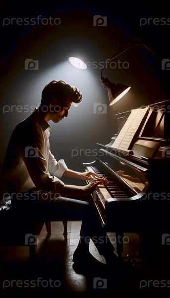 Композитор для фортепиано, лицо освещено одной настольной лампой, ноты в тени, Ai generated image
