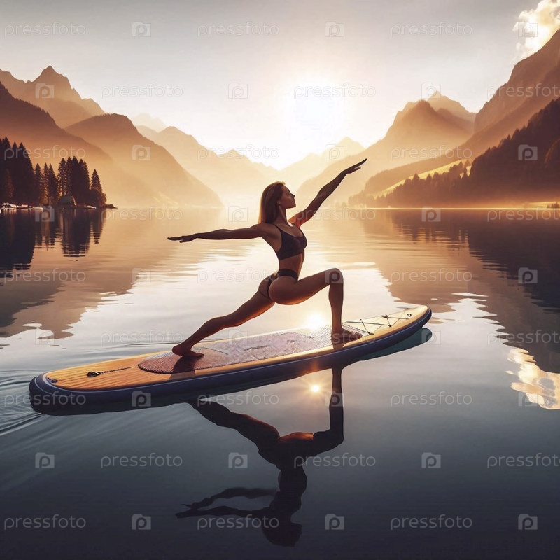 Практикующий йогу SUP в Warrior III позирует на борту над спокойным горным озером в золотое время, Ai generated image