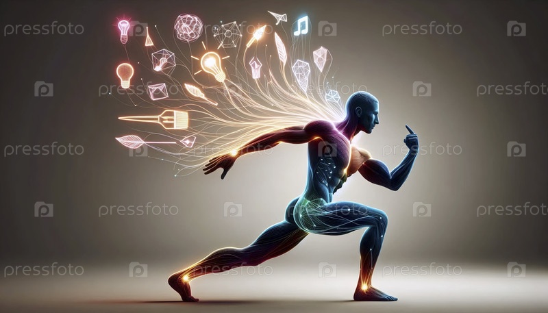 Практикующий йогу в широком воине II позирует с неоновым контуром и плавающими символическими идеями, Ai generated image