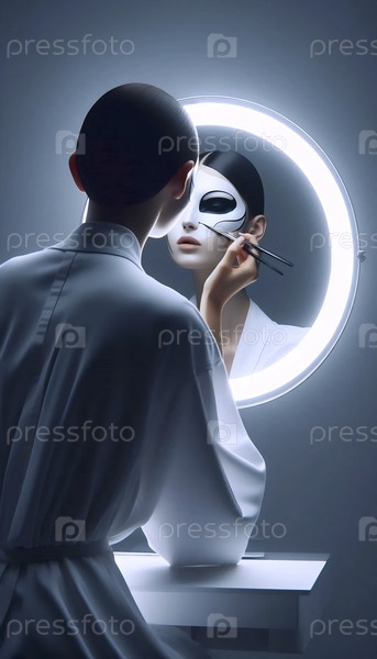 Вид над плечом модели в белом пальто, наносящей капли росы пинцетом, увиденный в зеркале, Ai generated image