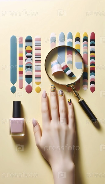 Графический плоский набор полос ногтевого лака рядом с рукой, а вырезанное увеличительное стекло показывает идеальное применение, Ai создал изображение
