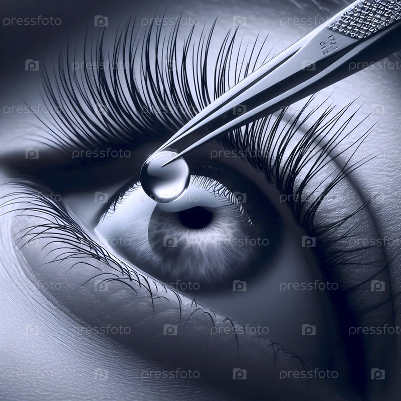 Ближайший план глаз модели, одна капля росы помещается на ресницы с помощью калиброванных пинцетов, Ai создал изображение