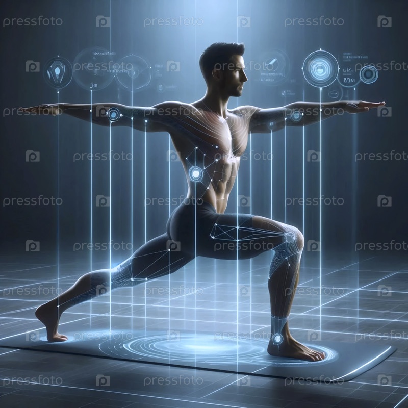 Умный практикующий йогу в позе воина с голографическими проекционными линиями, показывающими выравнивание и взаимодействие мышц, Ai generated image