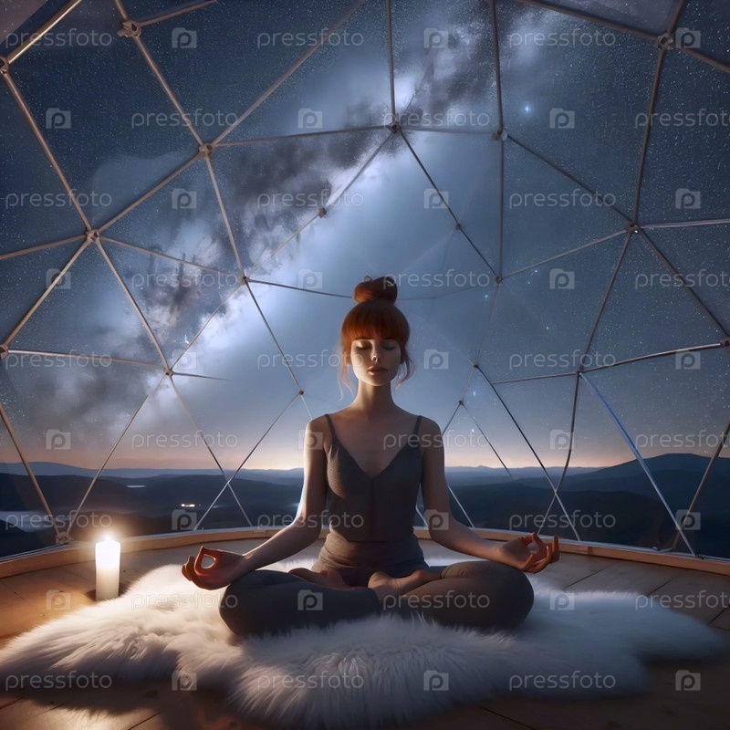 Практикующий йогу в мирной медитации внутри кристаллического геодезического купола под звездным ночным небом, Ai generated image