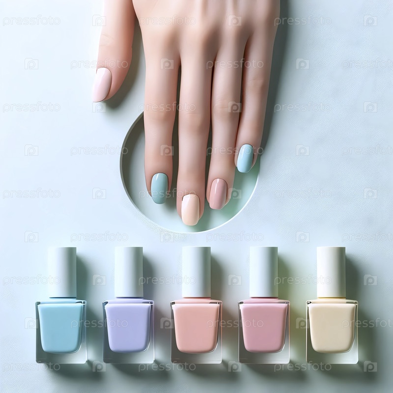 Графический плоский слой из пяти пастельных бутылок лака на ногтях, выравниваемых с вентилятором совпадающих ухоженных пальцев, Ai создал изображение