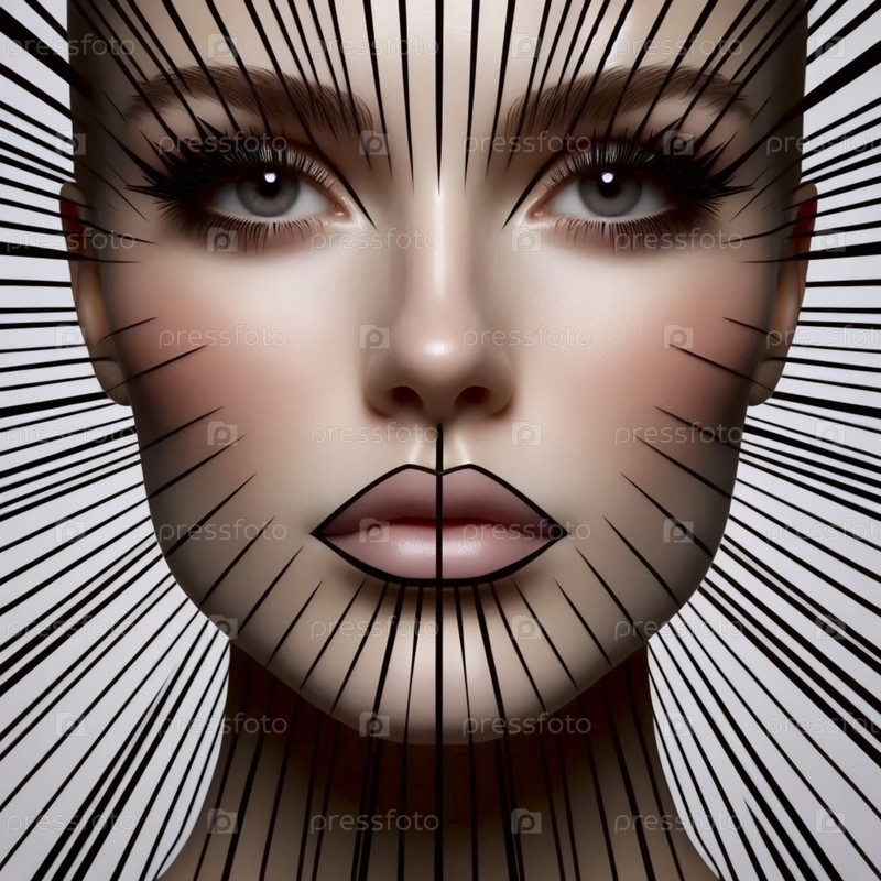 Клинический портрет: лицо с геометрическими губами, кристаллическими ресницами и радиальным узором волос, плоский белый фон, созданное изображение Ai