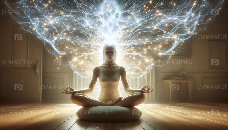 Нейрофитнес-практикующий с сияющими нейронными сетями вокруг головы во время сидячей медитации, Ai generated image