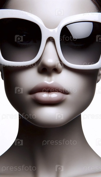 Лицо женщины, спрятанное за большими солнцезащитными очками с белой рамой, бледные губы разделились, Ai generated image
