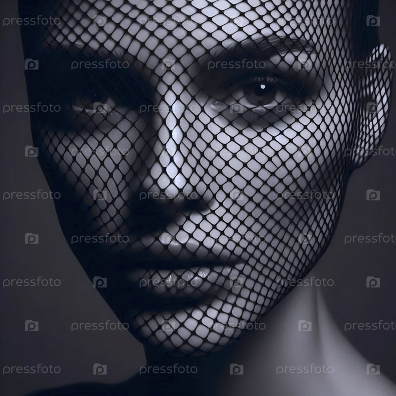 Лицо, покрытое затянутой черной завесой рыболовных сетей, создает геометрические узоры теней, Ai generated image