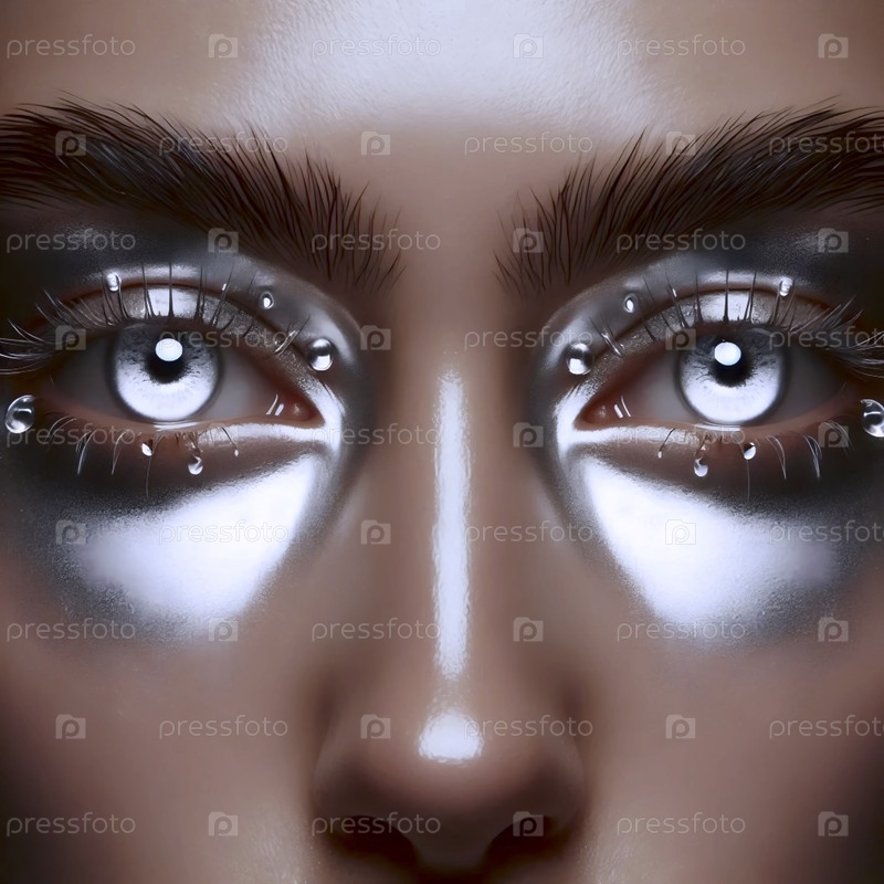 Зеркальная серебряная пленка на веках, отражающая кольцевые круги вспышек, с розовыми ресницами, Ai generated image