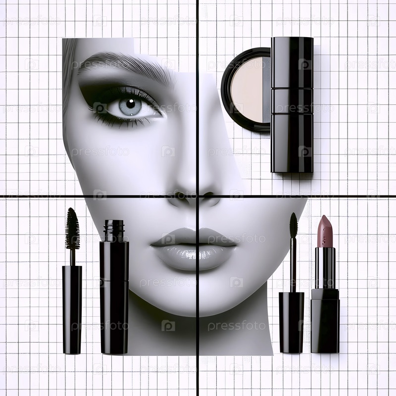 Плоская полоса головоломки лица: косметические изделия рядом с круглыми вырезками их применения, Ai generated image