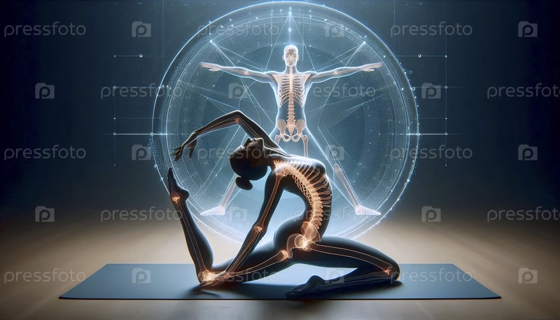 Умный практикующий йогу в позе треугольника с голографическим скелетным перекрытием, показывающим выравнивание позвоночника и углов суставов, Ai generated image