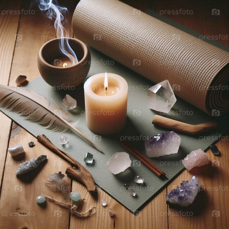 Плоская композиция матраса для йоги с горящими свечами, кристаллами ладана и перьями на натуральном деревянном полу, Ai generated image