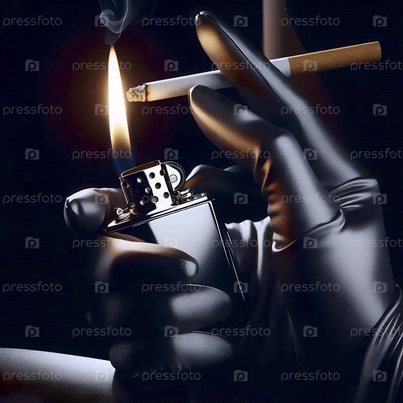 Женская рука в атласных перчатках, держащая зажигалку, собирается зажечь сигарету, Ai generated image