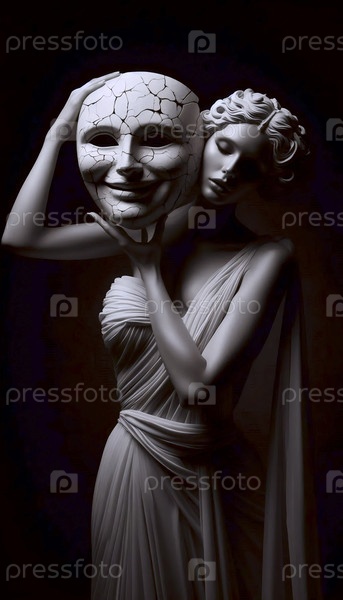 Танцовщица в платье греческого стиля, держащая большую треснувшуюся классическую маску над собственным лицом, Ай создала изображение