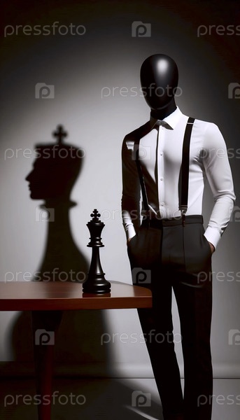 Мужчина в хрустящей белой рубашке и подвесках, лицо которого скрыто тенью большой шахматной королевской фигуры, Ai создал изображение