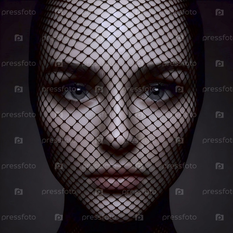 Лицо, покрытое затянутой черной завесой рыболовных сетей, создает геометрические узоры теней, Ai generated image