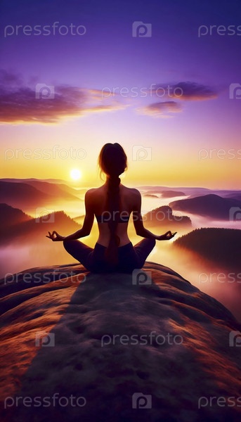 Практикующий йогу в медитативной позе на краю скалы при восходе солнца, Ai generated image