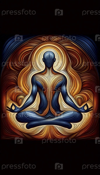 Абстрактная геометрическая композиция йоги с человеческим силуэтом, растворяющаяся в терракотно-синих и золотых тесселяциях, Ai generated image