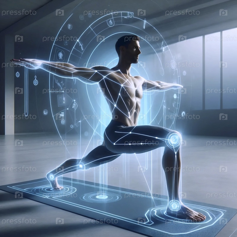 Умный практикующий йогу в позе воина с голографическими проекционными линиями, показывающими выравнивание и взаимодействие мышц, Ai generated image