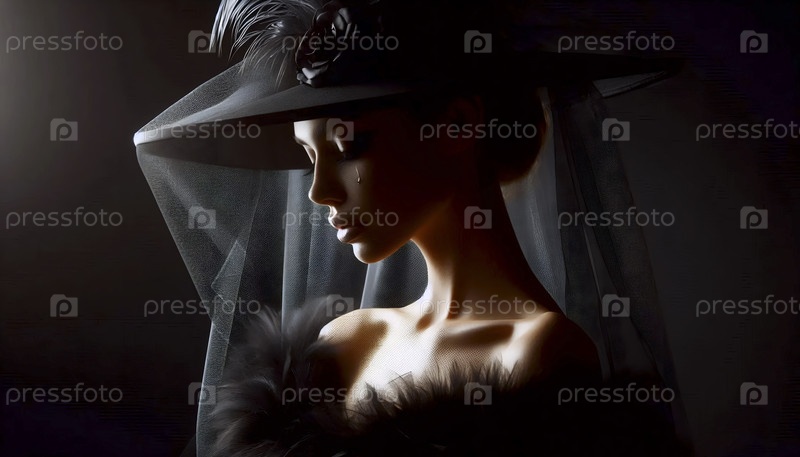 Гламурная вдова в черной шляпе с занавеской на лице, отворачиваясь, свет поймает одну слезу, Ai generated image