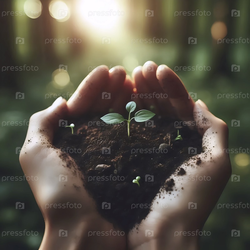 Близкий снимок рук практикующих эко-йогу, купающихся в богатой темной почве с растущими зелеными листьями в лесу, Ai generated image