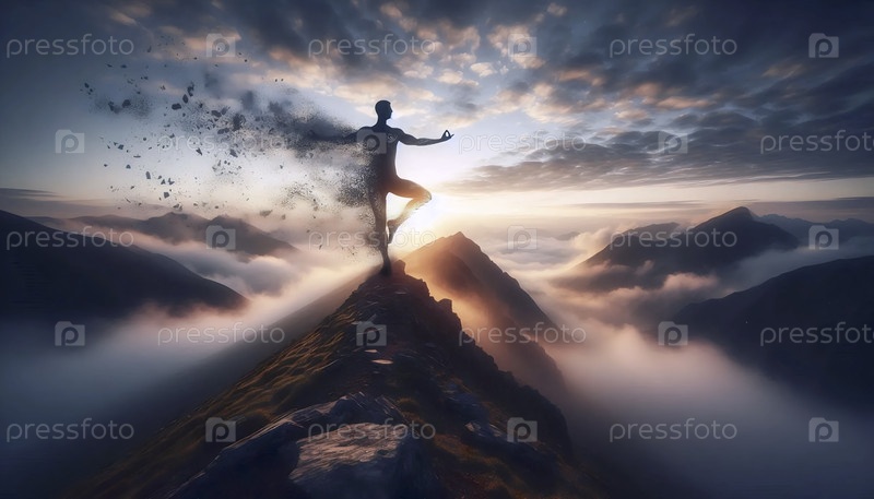 Практикующий йогу в позе воина на горном хребте с краями тела, растворяющимися в туманном пейзаже, становясь одним из элементов, Ai generated image