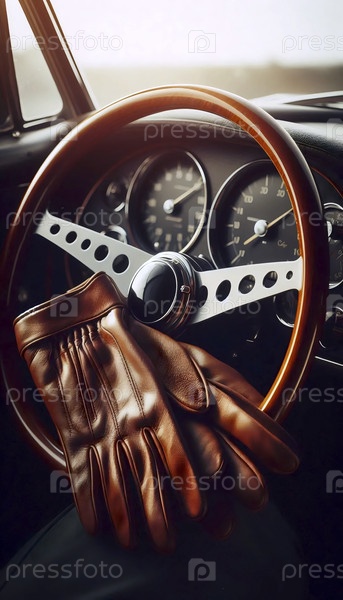 Пара кожаных водительских перчаток, обтянутых над рулем старого спортивного автомобиля, Ai generated image