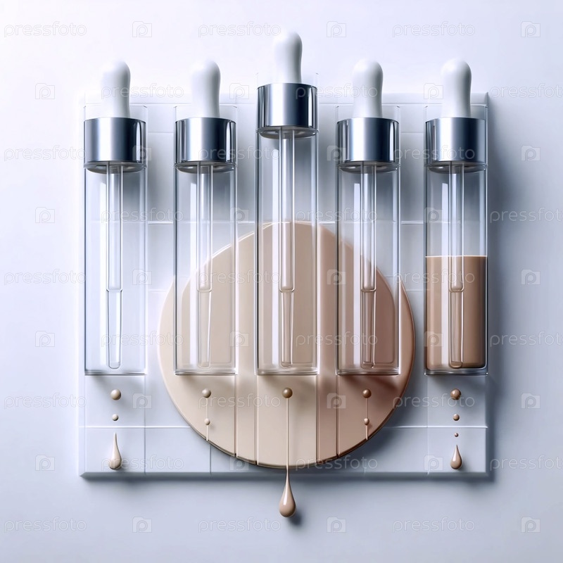 Плоский слой из четырех бутылок с капсулами, каждая из которых капает точкой на полоску градиента цвета кожи, Ai создал изображение