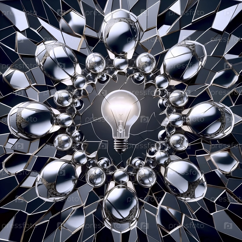 Капля ртути на разбитом зеркале, создавая множество разрозненных отражений одной лампочки, Ai генерирует изображение