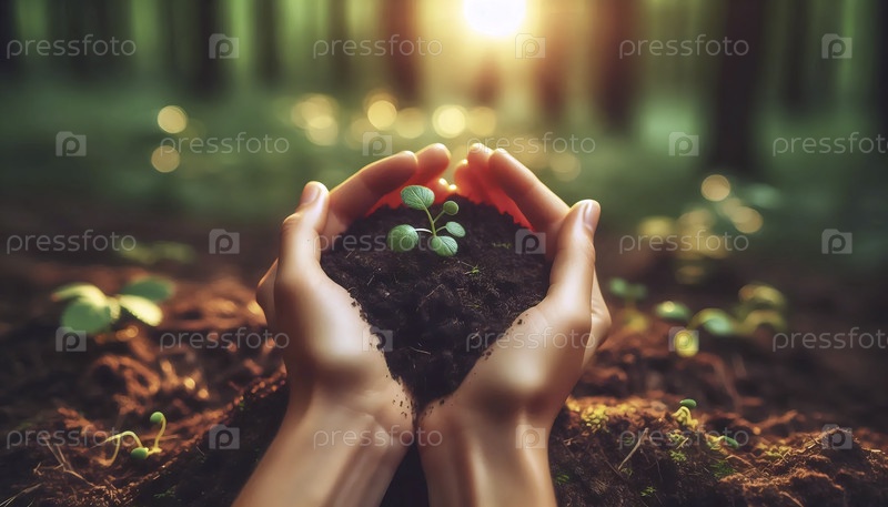 Близкий снимок рук практикующих эко-йогу, купающихся в богатой темной почве с растущими зелеными листьями в лесу, Ai generated image