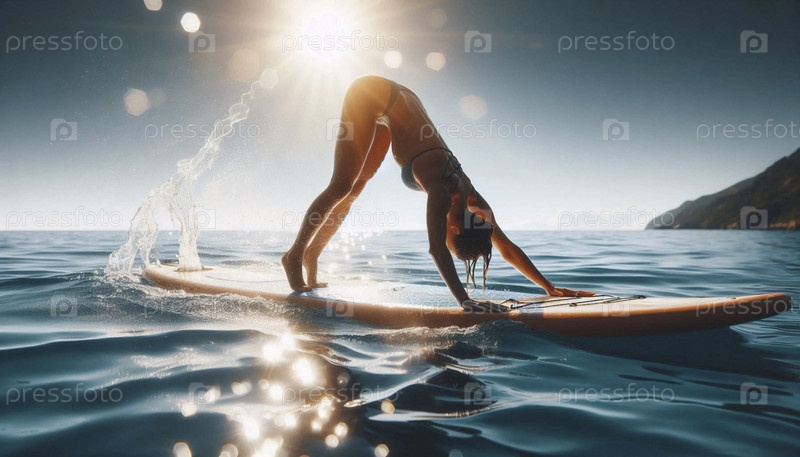 Практикующий йогу SUP в сторону собаки, повернутой вниз на борту с пятнами воды и эффектами солнечных вспышек, Ai generated image