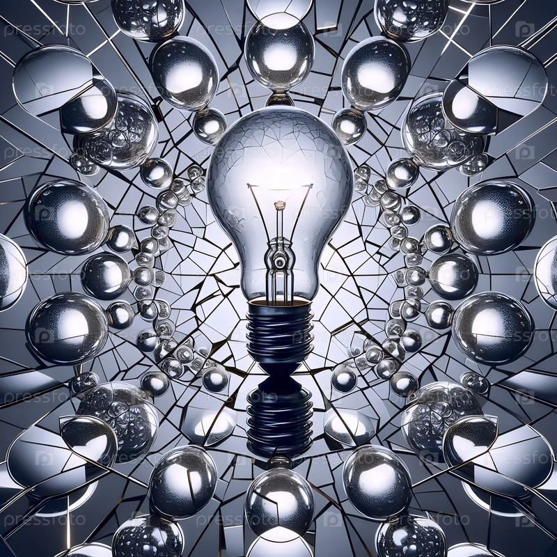 Капля ртути на разбитом зеркале, создавая множество разрозненных отражений одной лампочки, Ai генерирует изображение