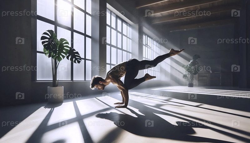 Динамический поток йоги в современной солнечной студии с большими окнами, Ai generated image