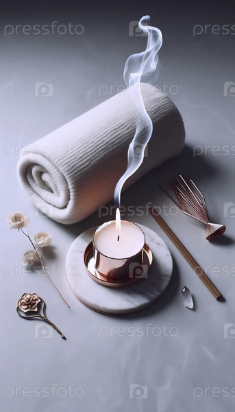 Плоская композиция реквизитов йоги со свечой из розового золота и спиральным дымом фимиама на мраморной поверхности, Ai generated image