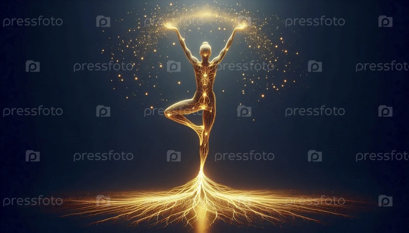 Практикующий йогу в позе на дереве с корнями, превращающимися в светящиеся геометрические узоры и восходящие частицы света, Ai generated image
